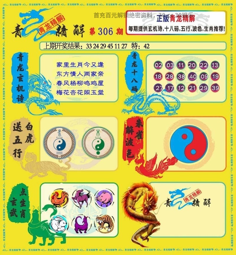 306期:【正版青龙图精解】家里生肖今又逢.东方情人两家亲.春风杨柳鸣鸡屋.梅花杏花照玉堂 |